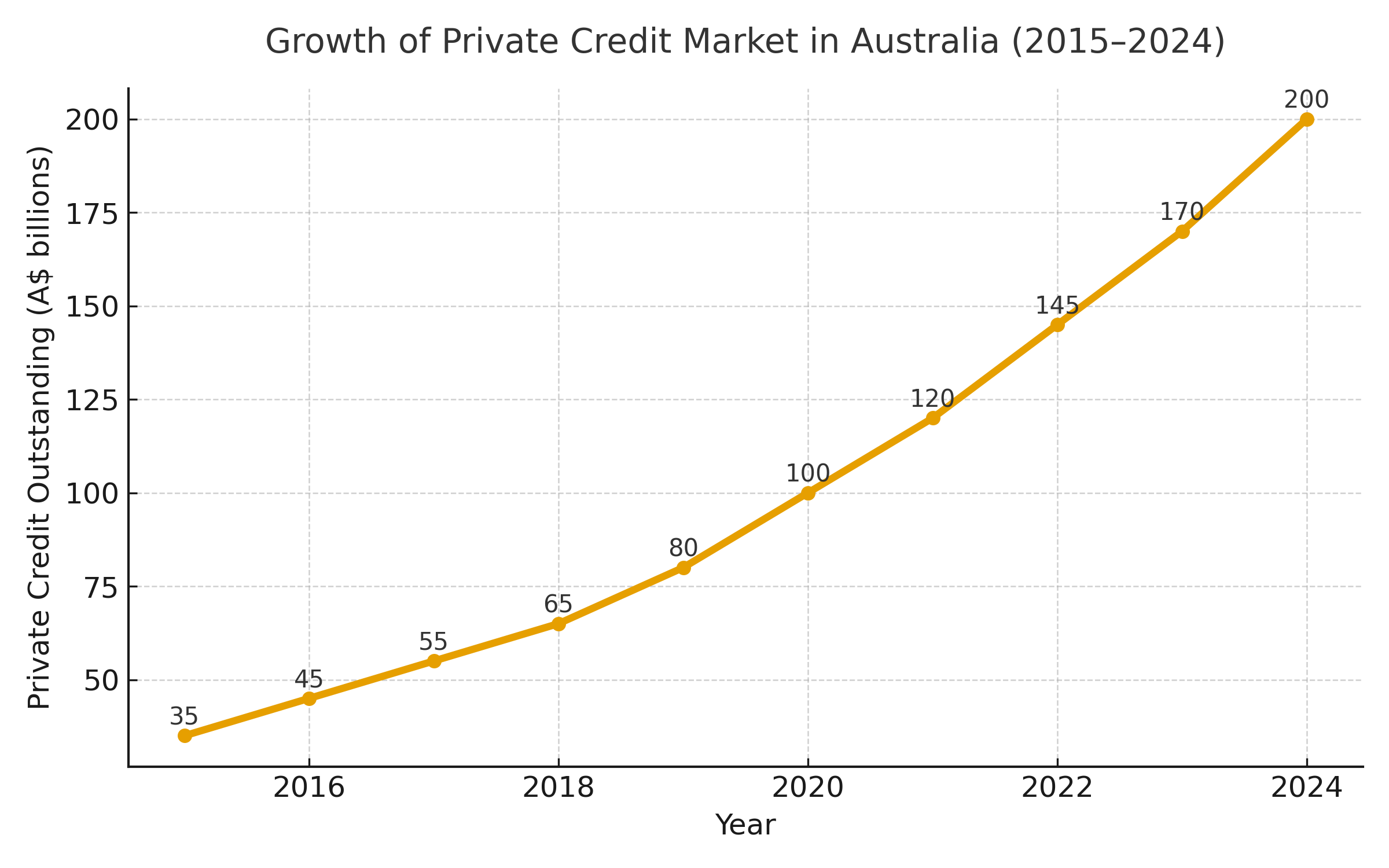 The size of Australia’s private credit market has grown from approximately A$35 billion in 2015 to around A$200 billion in 2024.